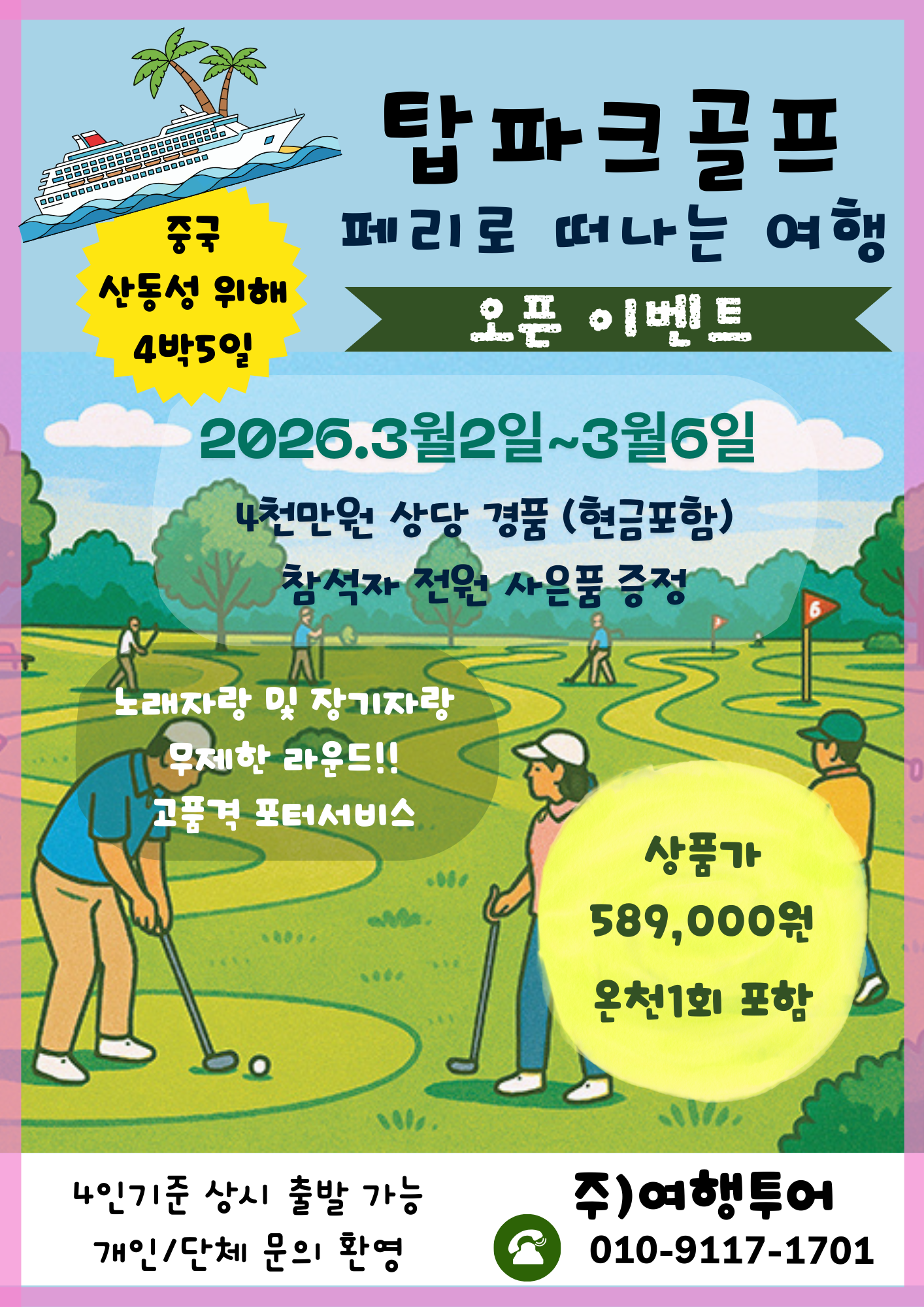 최소한의 장비로 짧고 간단한 코스를 돌며 골프의 묘미를 즐기실수 있는 생활 스포츠 입니다.국제선 왕복 선박권 및 유류할증료+ tax(한국 항만세, 중국 항만건설비)