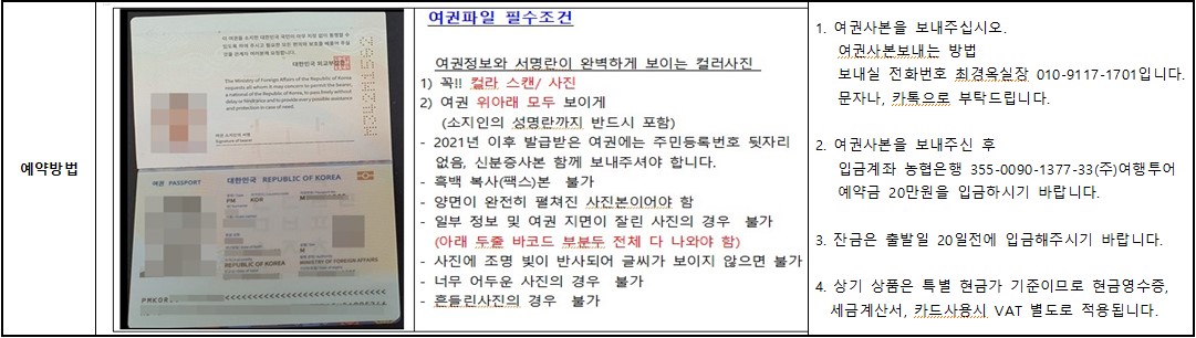 ♤ 상기 일정은 항공 또는 선박 및 기상, 현지사정에 의하여 변경될수 있습니다. ♤ 본 여행상품은 특정 연휴 및 공휴일은 제외되며, 상픔가 변동이 있을수 있습니다. ♤ 본 여행상품은 2024년 10월 기준으로 작성한것이므로 항공권 발권시 항공권, 유류할증료 및 급격한 환율인상으로 인한 상품가 변동이 있을수 있습니다. ♤ 본 여행상품은 예약금 입금 시점부터 계약이 체결되며, 계약 해제시 귀책사유에 따라 취소수수료가 부과됩니다. ★ 특별약관 – 공정거래위원회/ 표준약관 제10020호 준용 ※ 공정거래위원회 고시 제2014-4호 소비자분쟁해결기준에 의한 것 본 상품은 특별할인 그룹항공권 또는 선박권으로 사전 항공사 및 선사에 항공료 및 선박료를 입금한 상품으로
