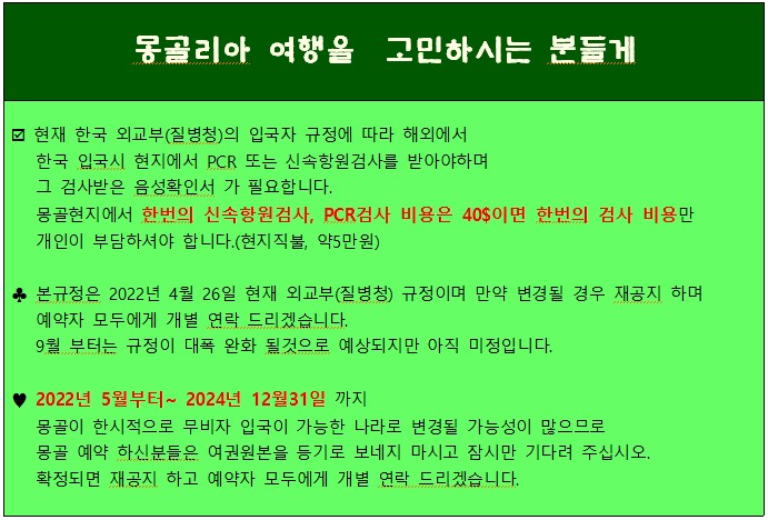 ♣ 몽골에서 한국 입국시 PCR 검사비(현지에서 직불) 1인 40$ - 몽골 → 한국 입국시 PCR검사 음성 확인서 필요함